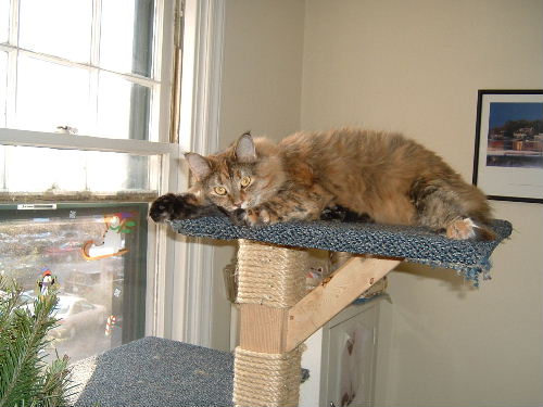 This cat is Echo (born April 1st, 2001) and she is a Maine Coon. She tops the scales at around 22 lbs and is only two years old with another year or two of growing. This breed is much more cat like and tends to be very friendly but not as relentlessly as the above two. Echo tends to chirp allot. Go to http://www.cfainc.org/breeds/profiles/maine.html for more information.