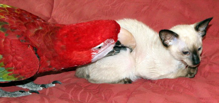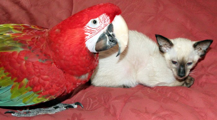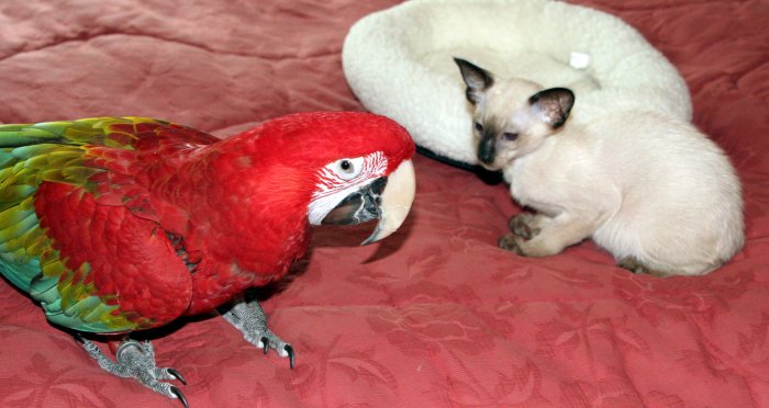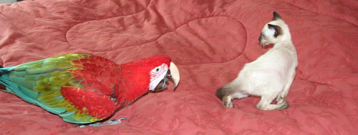 My new Seal Point kitten arrived on Delta today, May 17th, 2007. This guy was born at Gotier Cattery on February 3, 2007. Right now he is hiding in the bathroom with food and water but we've already begun the process of getting him used to the birds. As you can see Ariel remains a sweetheart and was the first of our guys to welcome him.