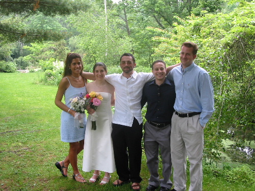 Myself (and my freakishly long arms), Jim, Jeff, Jen, and her maid of honor Vinetta at my wedding.