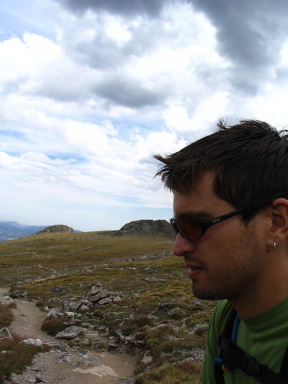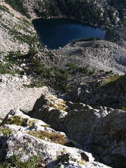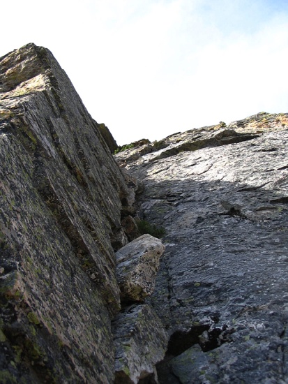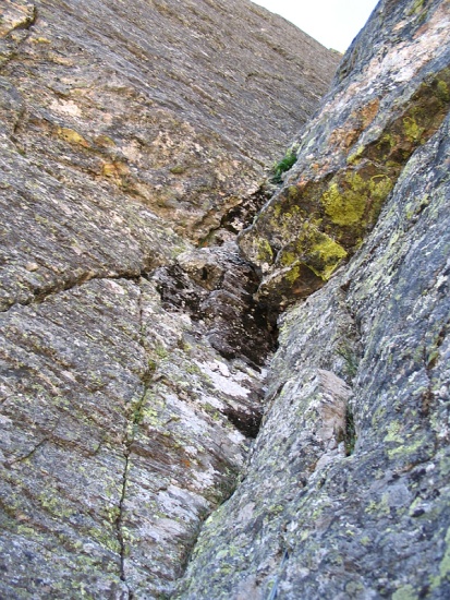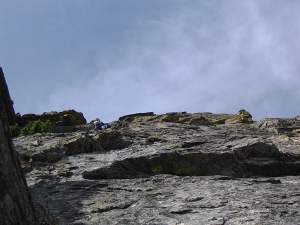 The last pitch was much cooler than the second to last one and involved solid 5.5 dihedral climbing almost to the top. Since this was an alpine route there were the occasional stretches of moss, huge spider webs, and one tiny dirt ledge which gave way under my foot (I would have held on to the wall if I was leading but I would have been hanging). This last pitch was about 175 feet and quite fun. I've heard people complain about the moss and dirt and blah, blah, blah but I'd suggest they are more rock climbers than alpinists. Most alpine routes I've been on in Colorado have the same character; ledges, dirt, moss, etc. It is what gives them character. If I want pure, clean rock I'll go to well-used crags or aim for big walls.