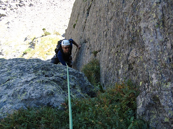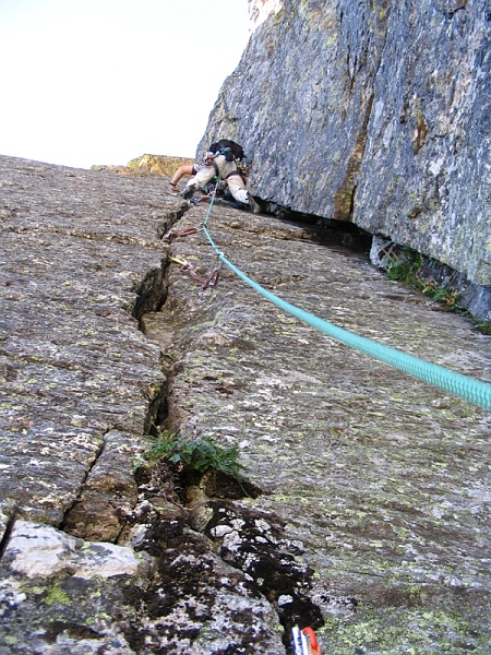 I took the first lead and moved up a much easier crack/dihedral than the one below. At first I was putting in gear every 20 or so feet but the climbing quickly relented to 4th class to 5.4 with occasional high stepping 5.5 moves so I ran out about 60 feet of rope and finally stopped at about 160 feet when I found a decent belay on a huge grassy step. I belayed Nick up to me and he then took off for the top.