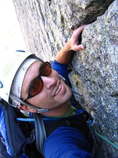 Once he had successfully completed the face, Nick traversed back left and up a slot which dumped him on another ledge. This pitch took about 150 feet of rope and definetly required long slings to minimize drag. I followed up after Nick and once on the face realized the climbing was much harder here than on my pitch. I'd say this part was hard 5.7 with sections of 5.8 thrown in so ultimately, Nick led the real crux of the day.