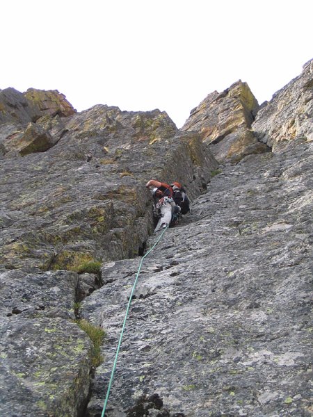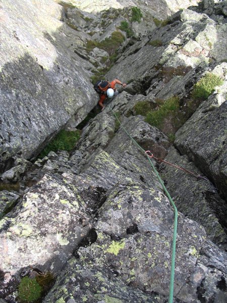 At the top of this short pitch I stopped and belayed Nick up to me. It is more than possible to combine this pitch with the next one but I wanted a photograph of myself in the dihedral so I needed Nick in eyesight.