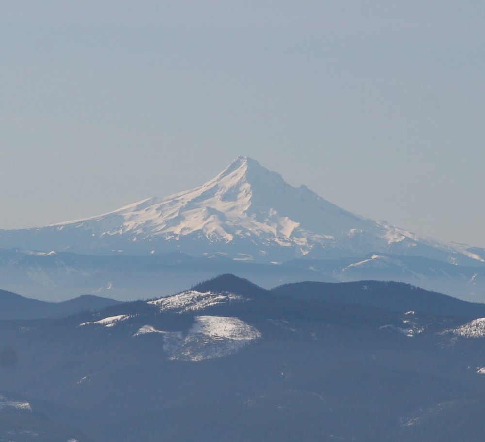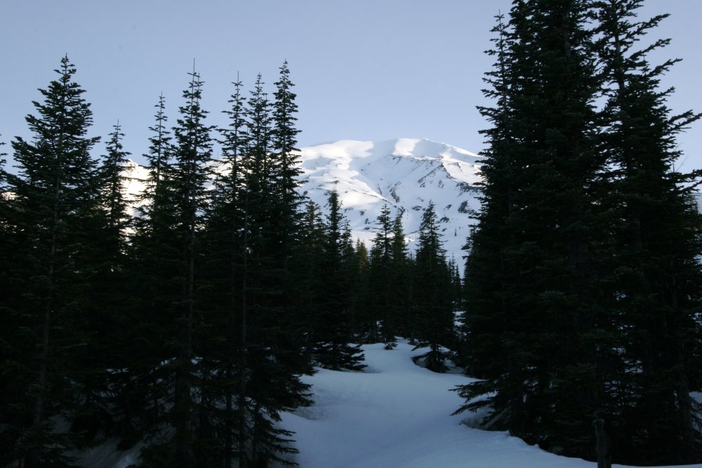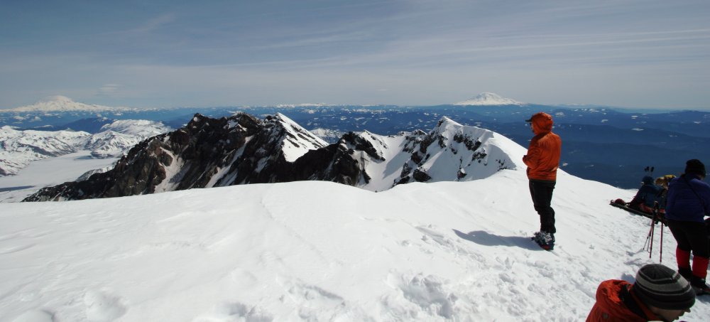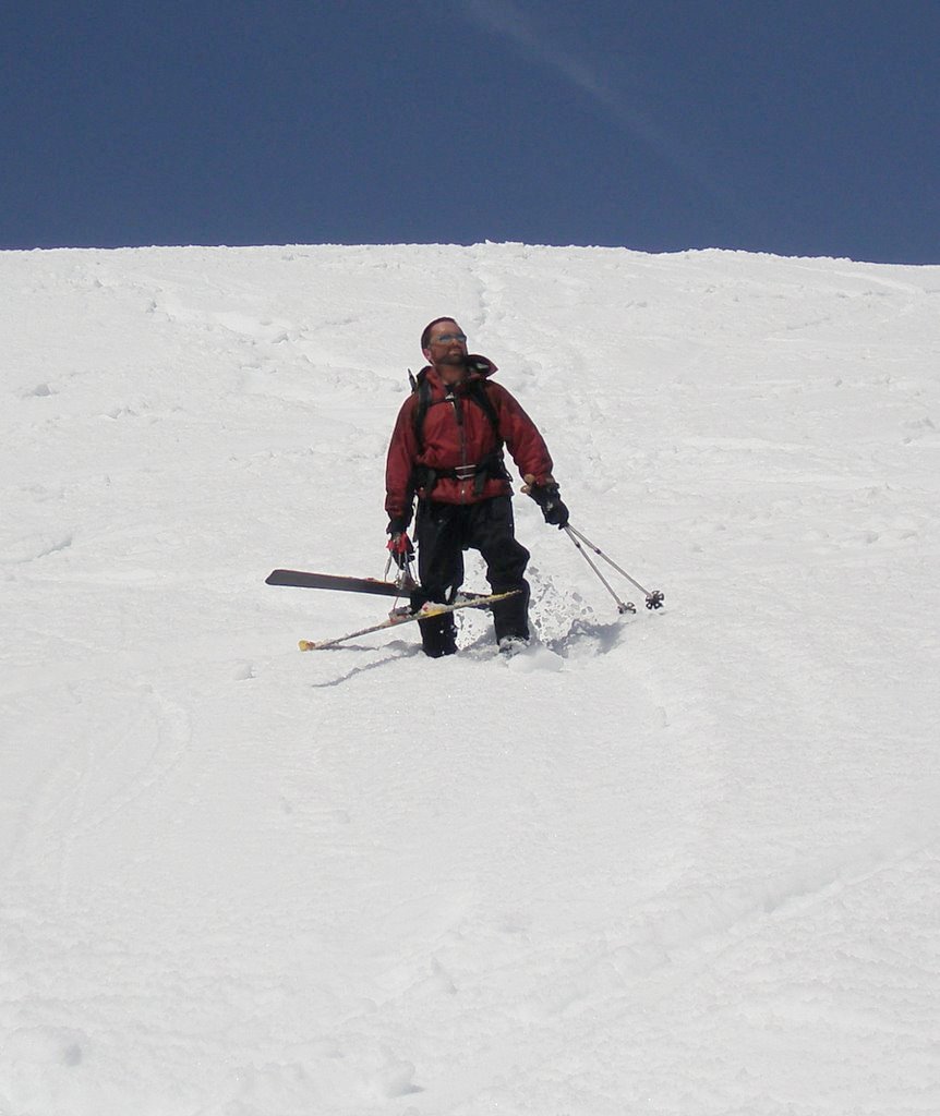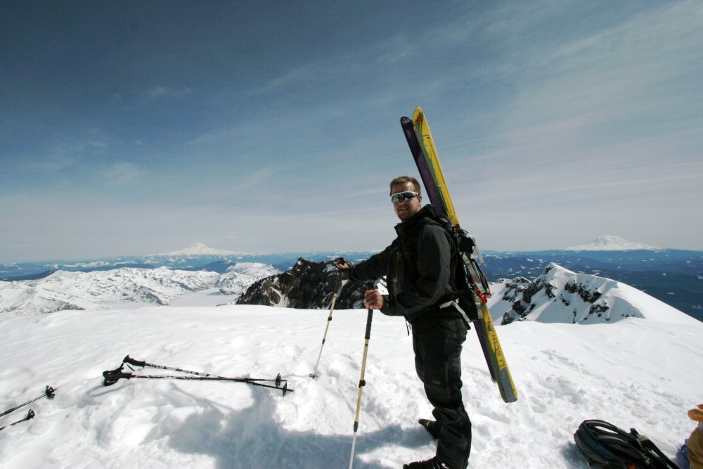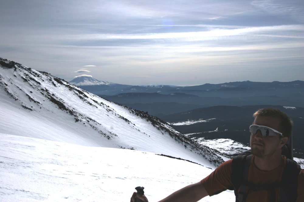 The views were magnificent, Hood, Baker, Rainier, and Adams were visible all day long and the weather was perfect. I attempted to ski down on a pair of 185 tele skis. I quickly learned a few things: 1. I can't tele worth a damn. 2. I can't use 185s well. 3. I can't ski pacific northwest mush, especially stuff that sucks your skis in and you fall up to your chest in if you come out of your ski.