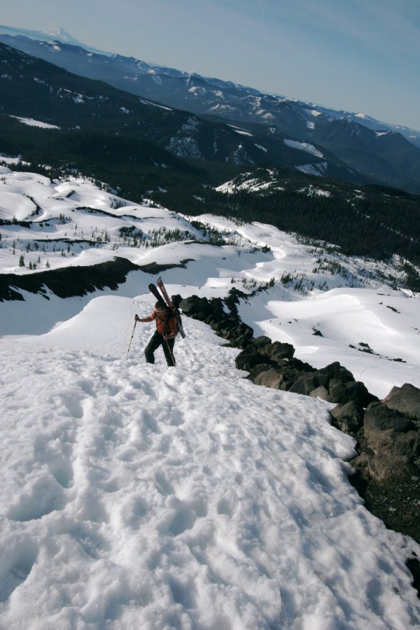 Brian and I flew out to Portland over the weekend of April 18th-20th, 2008. The original plan was to do the Leuthold Rotue on Mt Hood and then ski down the standard route. As luc would have it the avalanche conditions were to sketchy so we opted to hike then ski Mt. Saint Helens. The peak itself was very easy, I imagine I could fast bag it in 5 hours car to car if that was a goal. The hike up was quite easy but slowed at times by hoardes of people, I've never seen that many people on a peak before, not even on easy Sawatch or Front Range 14ers in Colorado.
