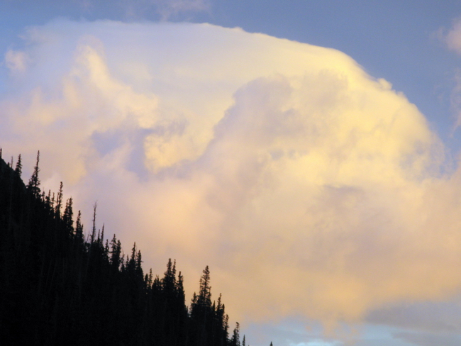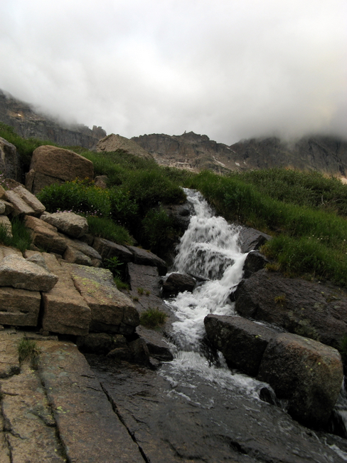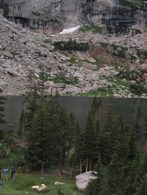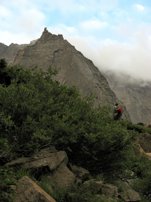 The following weekend, August the 4th, I attempted to climb the North Buttress route on Pagoda Peak. I went with a guy named Tim Halman whom I had met when I climbed Gambit in Eldo. We spent the night at the Moraine park campground and woke up super early. We hucked all the gear right to the base of the climb which looked absolutely fantastic ~1500 roped feet up to 5.7, but the weather was terrible so we turned around. It was a shame because even though the weather looked as bad as I'd seen and had all the accompanying signs like building cloud tops, rapid cooling, etc, it ended up never doing anything. To top it off my knee gave out on the way down. Ah well, the area is gorgeous and it has ignited a desire in me to do all the peaks up there in the coming years. For some reason my knee has the bad habit of giving out every now and then but seeing as I was planning on a trip to the Grand Teton soon this was not a good time. Tim was patient with me which was cool because I was not moving quickly and was in a ton of pain. We spent a good bit of time at Mills Lake while I waited for my knee to heal up some and fed some of the chipmunks there. While we were hanging out a couple from the east coast started chatting with us. The guy noticed that we had rope and started saying we must be 'free rapelling' and that he had never done that but had been 'assisted rapelling' a long time ago. I wasn't sure what he was talking about but can only imagine he thought we hucked rope all the way up there to find something to rap off of. I didn't feel like explaining what we were doing so smiled and agreed with him and he went off happily. After a time we got up and headed back to the car. Both mine and Tim's schedule are pretty tied up but hopefully we can get out and do something in September.