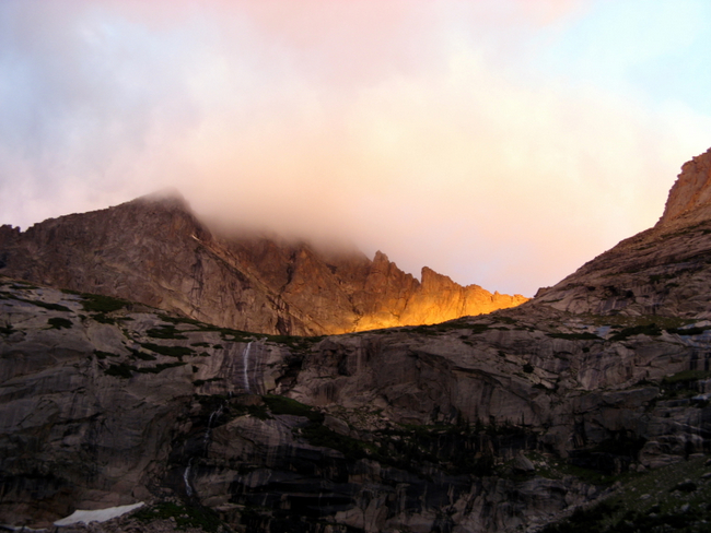 There was no way I could attempt the grand without seeing if my knee was still bad so Jen and I decided to get out and give the Thatchtop-Powell traverse a try. I'd gotten a lot of beta from people on summitpost and Andy Leach had a good trip report describing it. The traverse looked fantastic and we planned to go over and do Taylor Peak as well before descending via Andrew's Glacier. Jen had never been in any of these areas so I thought it would be both a good test of my knee and an opportunity to show her a lot of places I had climbed. We awoke at 2:15 Friday, August11th and headed to the park. The weather was gorgeous and we were feeling good. We were on our way by 4:00 AM. We made it up the climbers trail and to the junction that splits the trail to the Loch and Glacier Gorge in short order. There is no super obvious way to get up Thatchtop as it requires finding your way through the woods to a split in the cliff band. The two options are to cross icy brook on the way to Glacier Gorge and immediately head into the woods or to head to the Loch and cross the stream right before the switchbacks. In the dark both of these would require a bit of route finding and the Icy Brook option at least had a bridge so we choose that one.