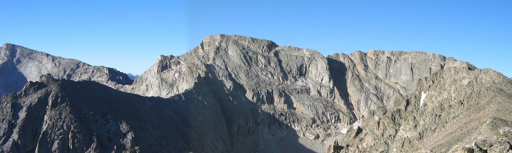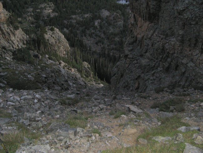 We turned right as soon as we crossed the stream and followed a faint climbers trail for a time. We soon lost it but I had a good idea of where the cliff band was so angled up and left. It was kind of fun being in the woods with no trail or light but it came to an end quickly as we reached a cliff band with an obvious trail next to it. We followed the trail up which required the odd bit of scrambling before it dumped us on a talus field below the gully. This part went pretty quickly and we were soon up the gully and, after a bit of bushwhacking through dense trees, were on Thatchtop's endless slopes. This part was easy but annoying as it required about 1500 vertical up class one and two tundra and talus. I was feeling okay but Jen was moving very slowly. By the time we got to the top of Thatchtop it was clear she was not feeling well. The altitude was bugging her and she had re-injured an ankle that she had turned the week before. It was too bad because it was as perfect a day as I can remember but there was no way she was going to make the traverse and add many extra miles. We did however spend a good hour an a half on the summit enjoying the views of the surrounding area. I pointed out The Petie, Zowie, Sharkstooth, Andrew's Glacier, all the Peaks in Glacier Gorge, Flattop, Hallet's, Lumpy Ridge, Ypsilon, and The Mummy Range to her. While Thatchtop itself is a boring peak it does offer 3400 vertical in elevation gain, some interesting route finding, and the best views in Rocky Mountain National Park. It is also the ONLY place I have been able to see the four aces on the Blitzen Ridge.