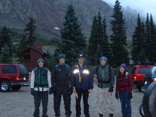 Eric and Kevin arrived at my house on the evening of Friday, August 29th, 2003 and after dinner went to bed nice and early. We all awoke at 3:00 in the morning and Brian and Joe arrived to my door at 3:30. We set out for Torreys Peak and ignored the Doppler radar which indicated a rain front from Colorado to Pennsylvania. Now while I love the book by Roach he really should update his dirt road to trailhead conditions. I managed to get my little Escort about one mile up the road before parking and jumping in Eric's four wheel drive. Here is a picture of us at the trailhead around 7:00 in the morning.
