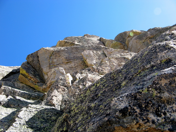 5th and 6th leads climb up the steep slabs and blocks on the right edge of the nose of the ridge, 5.5.